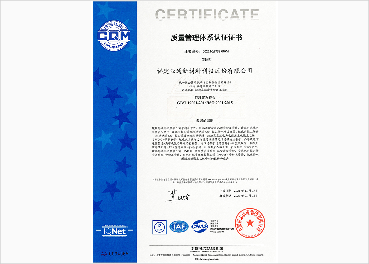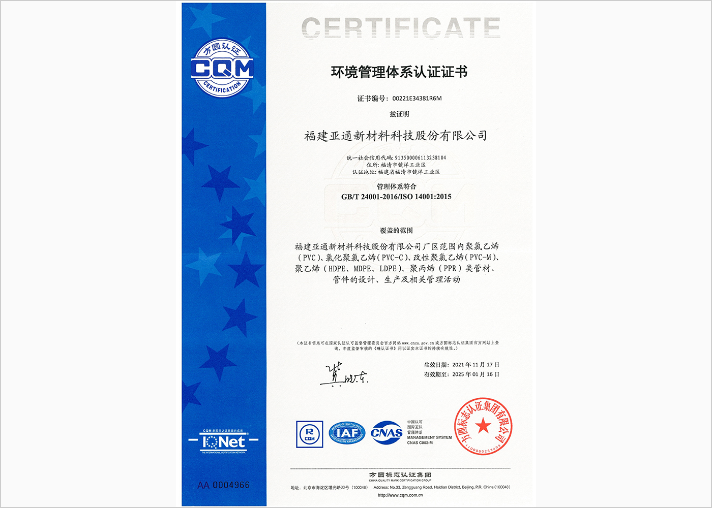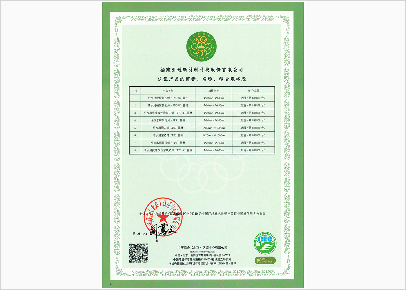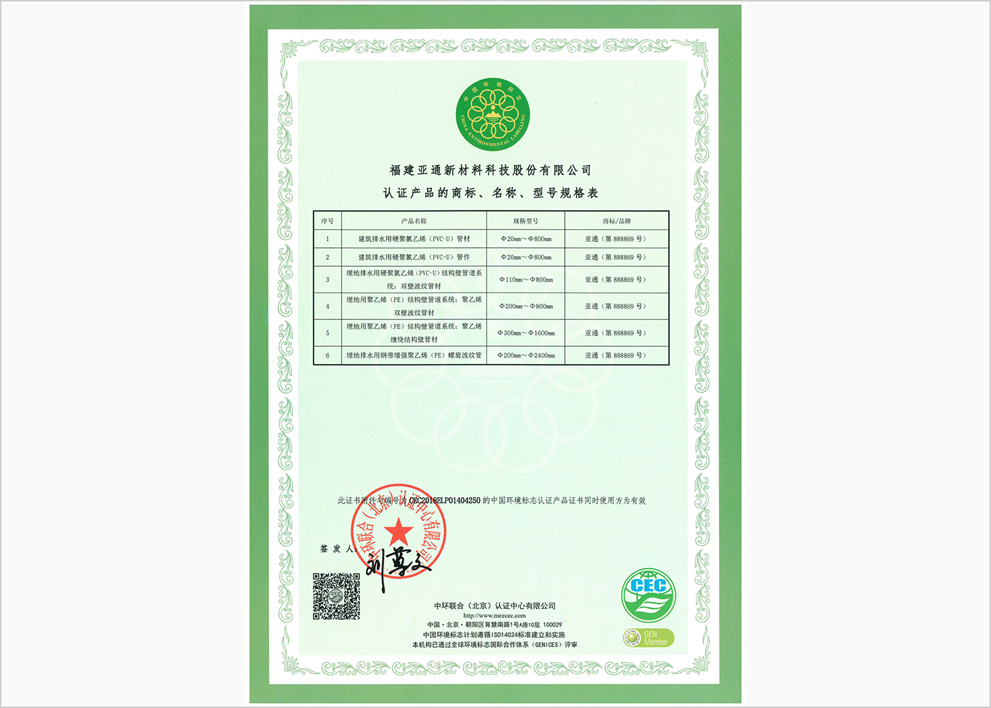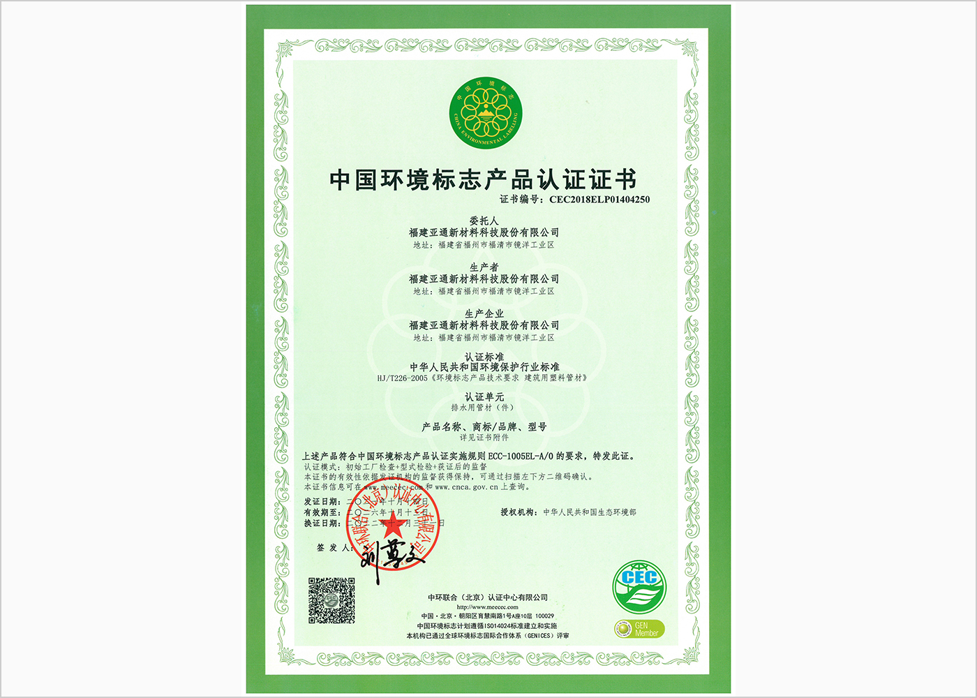 排水管系列中國環(huán)境認(rèn)證產(chǎn)品證書