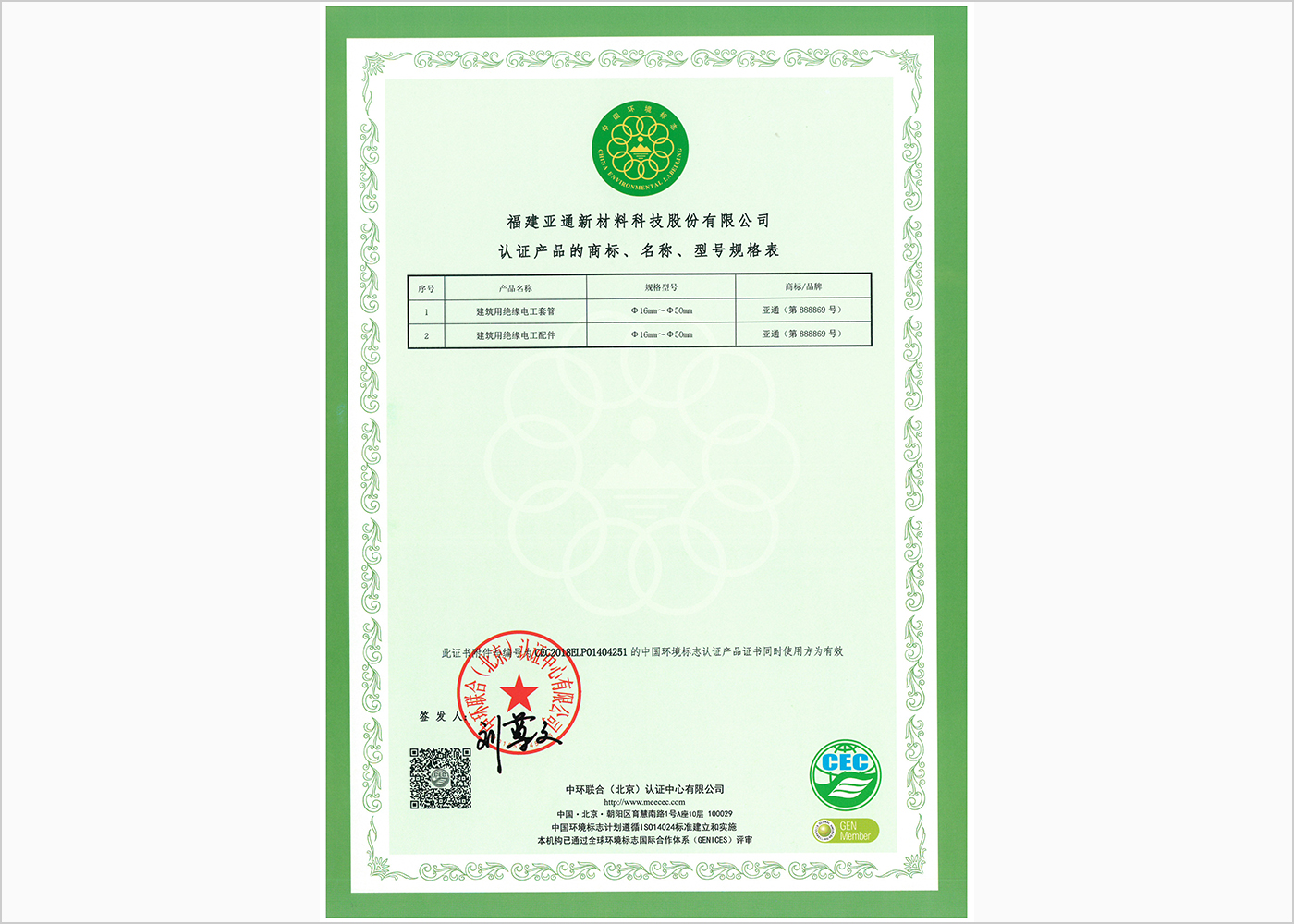 建筑電工管中國環(huán)境認(rèn)證產(chǎn)品證書